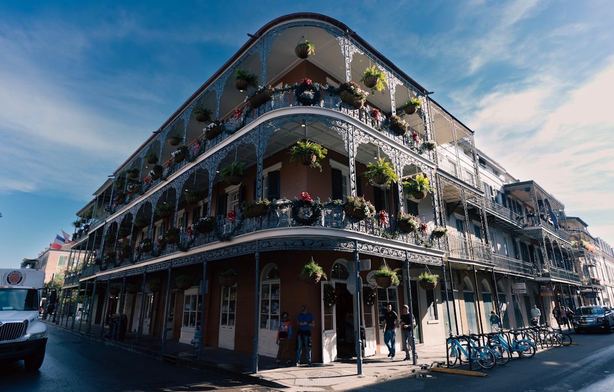 The French Quarter’s balconies and courtyards resemble a European street scene, shaped by French and Spanish colonial eras and marked by ironworks, stucco walls, and tightly packed, walkable blocks.