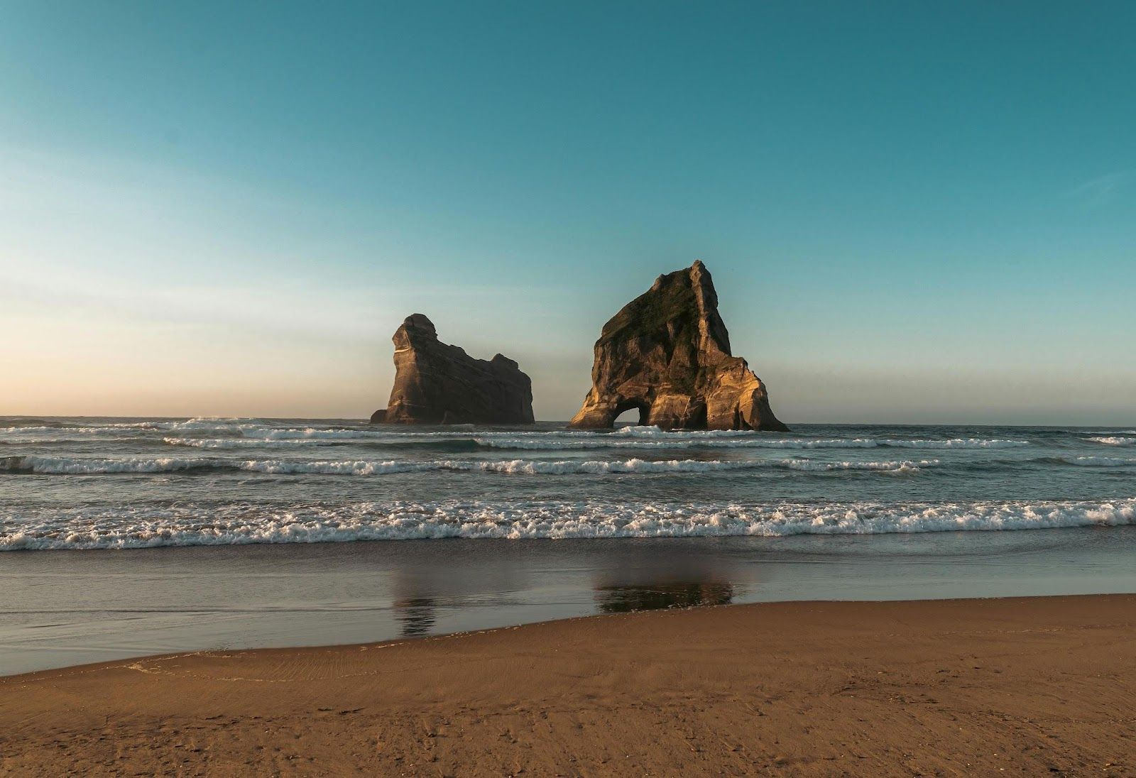 Those massive rock arches rising from the surf are the Archway Islands, right on Wharariki Beach, facing the Tasman Sea. This landscape from the north of New Zealand’s South Island became one of people’s favorite screensavers thanks to a glorious picture taken around sunset from inside one of the caves under the hills.