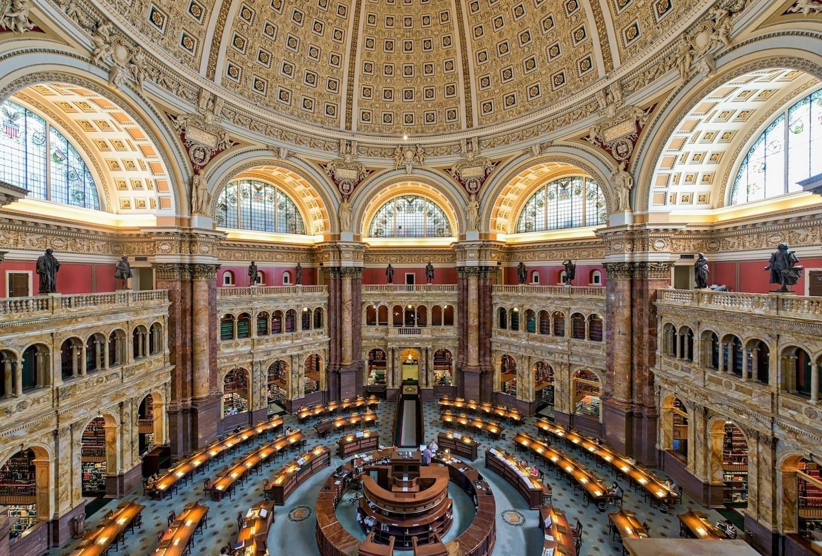 The Thomas Jefferson Building of the Library of Congress feels more like a European palace than a public library. Its grand hall is filled with mosaics, murals, and sculpted figures celebrating knowledge.